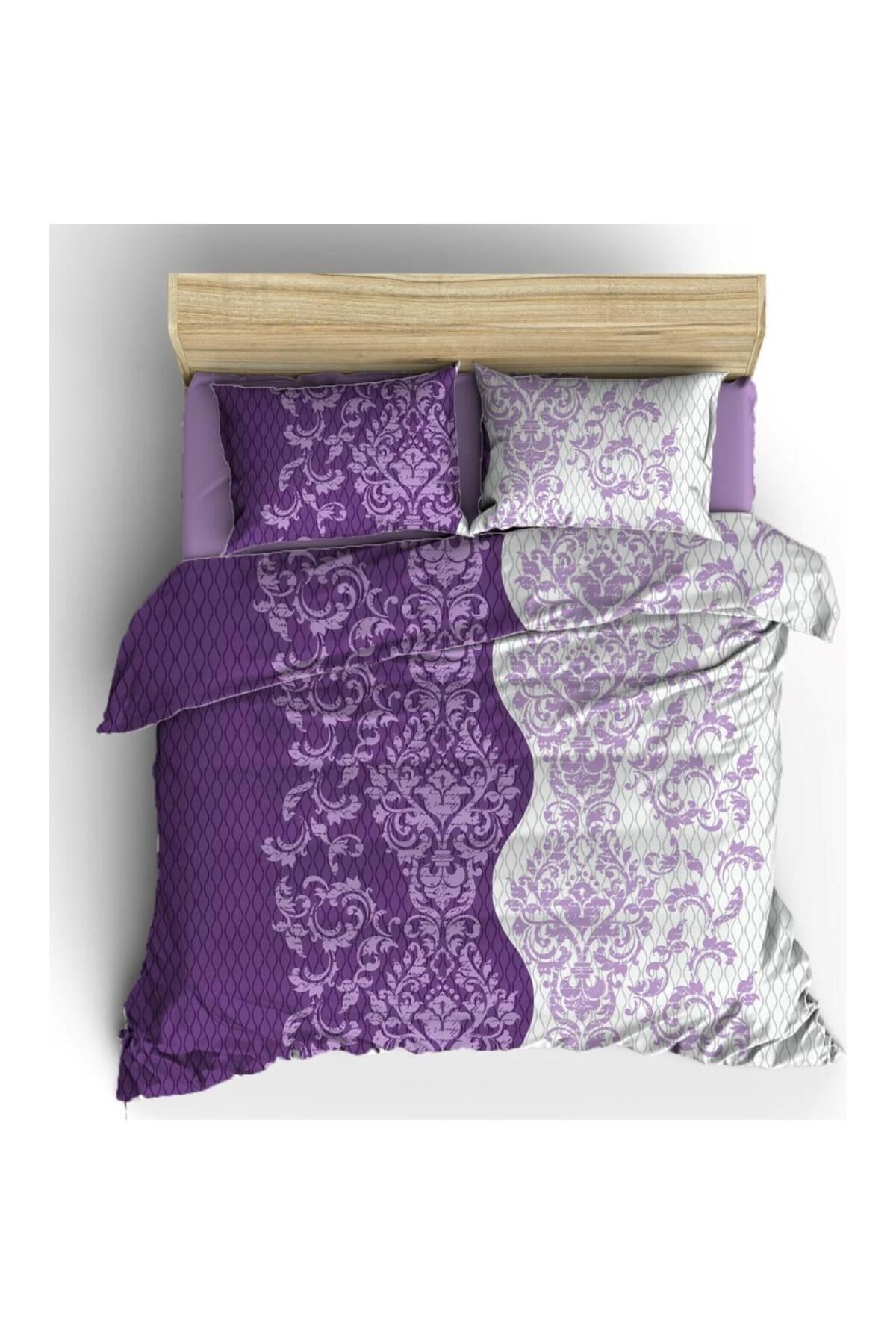ÇİFT KİŞİLİK PAMUKLU RANFORCE KUMAŞ NEVRESİM TAKIMI ( ÇARŞAFI LASTİKLİ ) MOR YOLLU