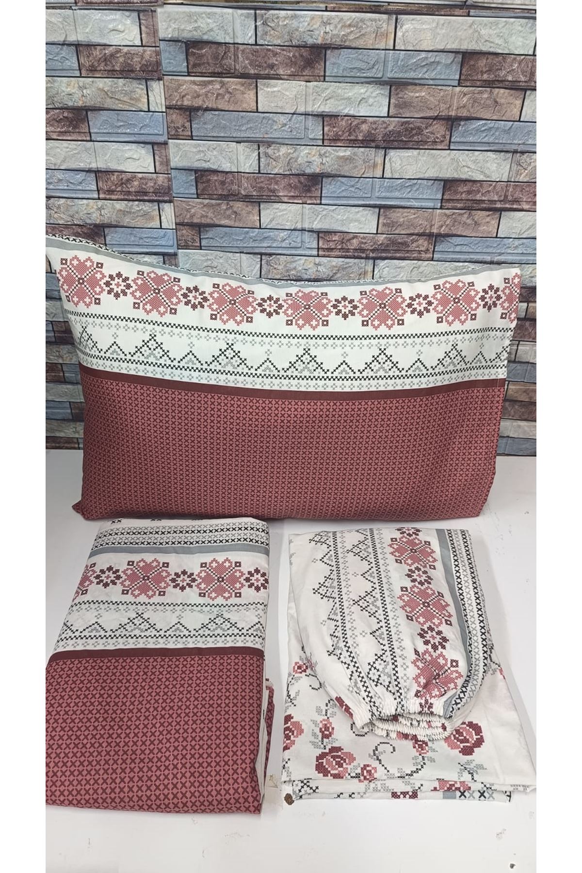 Çift Kişilik Kanaviçe Desen Pamuklu Nevresim Takımı ( Çarşafı Lastikli ) Kiremit