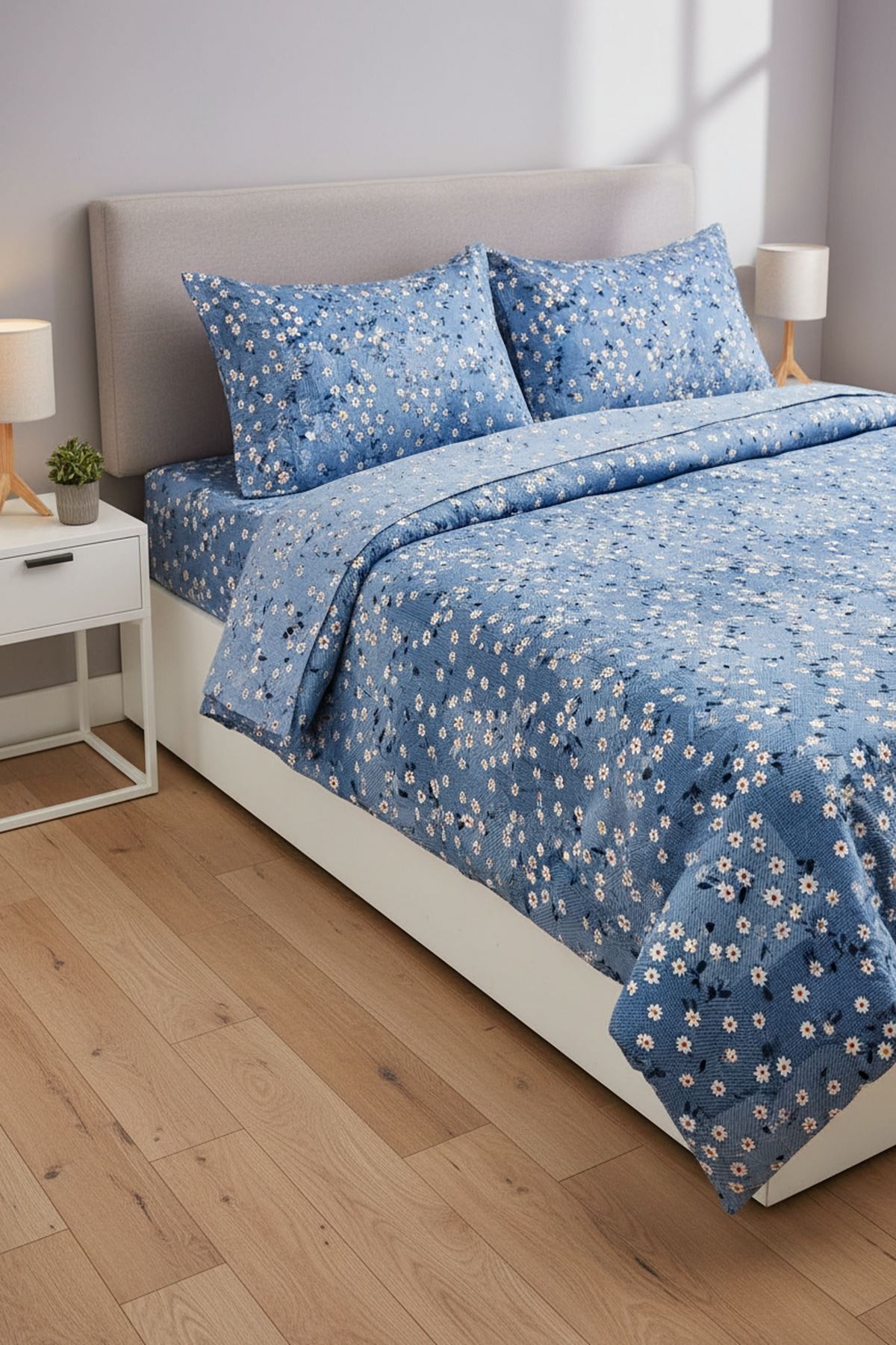 Pamuklu Kumaş Papatya Desen Çift Kişilik Nevresim Takımı Mavi