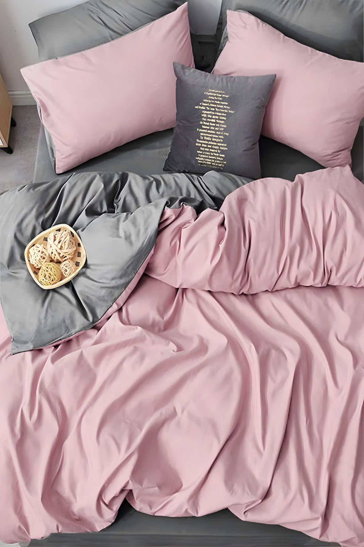 Ranforce Çift Kişilik Lastikli Çarşaflı Nevresim Takımı Pembe gri